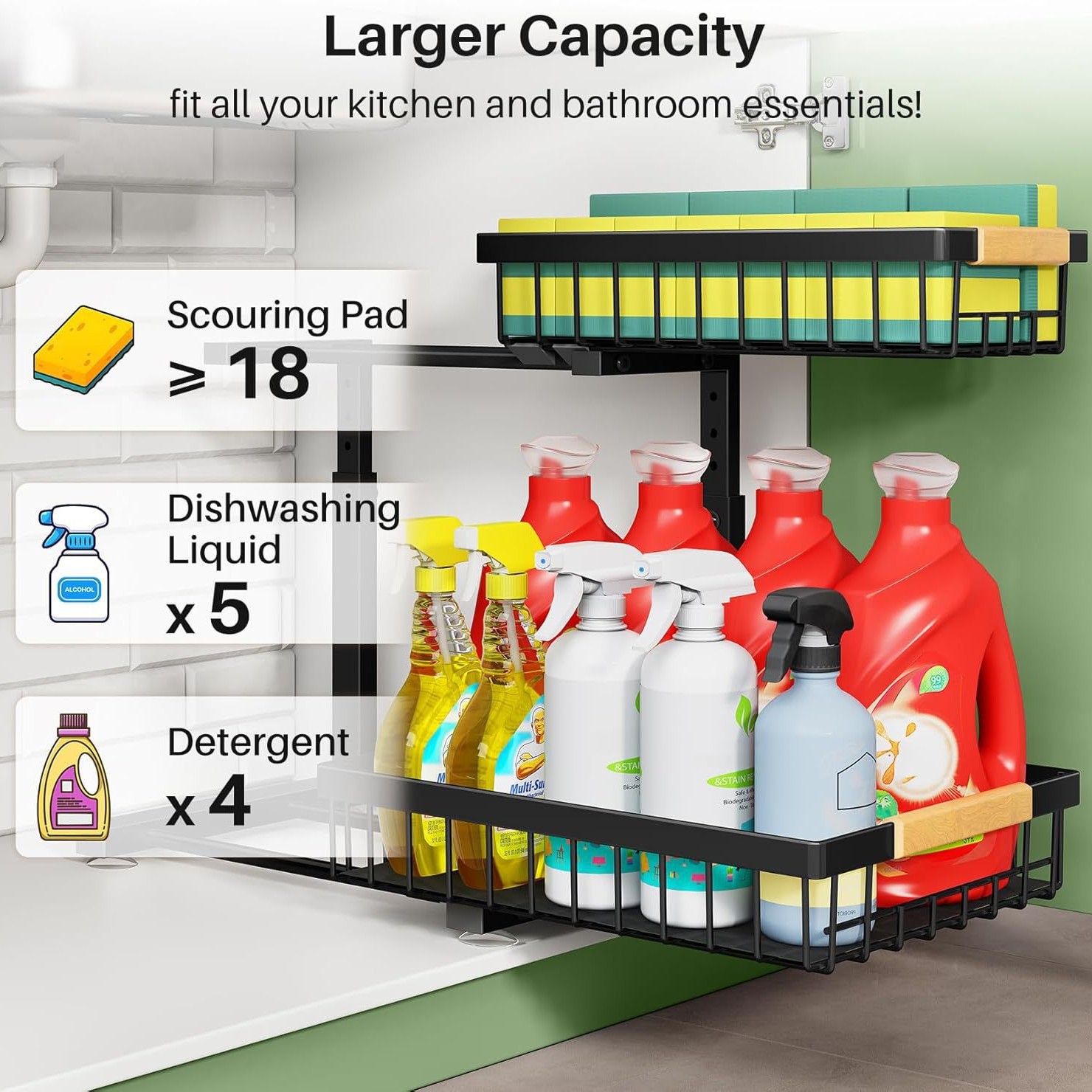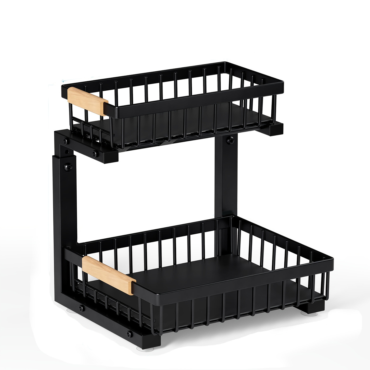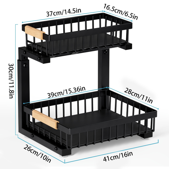 The sink storage rack can be pulled up and down. It is a kitchen storage rack under the sink